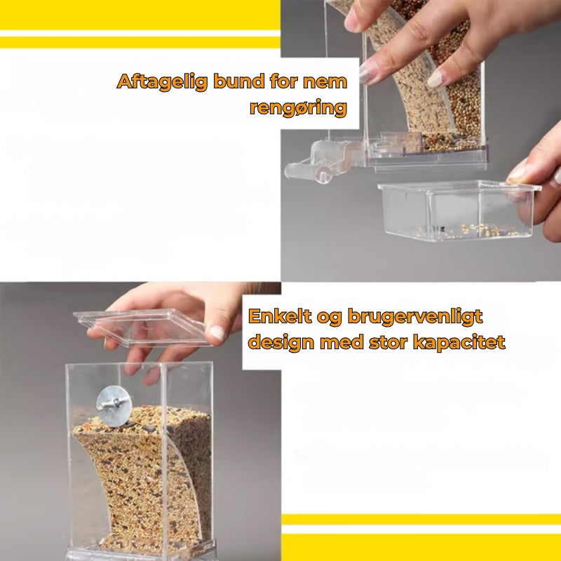 Låget kan åbnes direkte, så du let kan fylde foder på uden at skulle afmontere hele foderbrættet. En praktisk og gennemtænkt løsning til din elskede fugl!