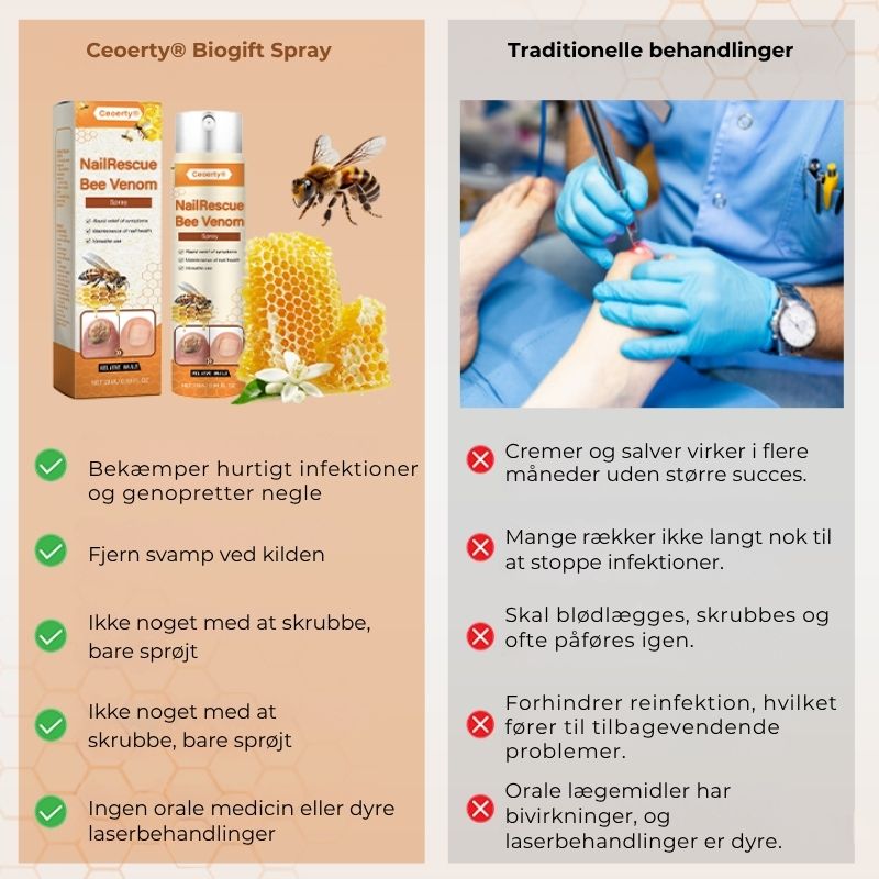 Oplev den ultimative løsning med Crucial® NailRescue Bee Venom Spray – en revolutionerende formel, der bekæmper selv de mest genstridige svampenegle! Takket være de naturlige svampedræbende og betændelseshæmmende egenskaber i bi-gift virker denne innovative spray hurtigt til at fjerne infektioner, fremme sund neglevækst og styrke neglenes styrke og glans. Se mærkbare forbedringer på bare 4 uger!