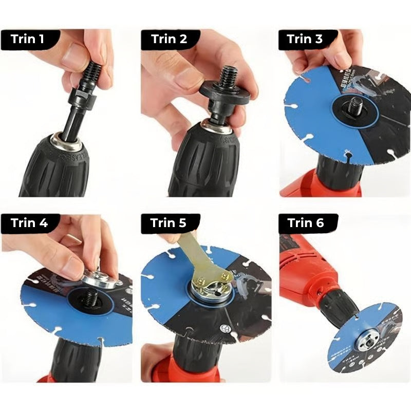 NEM AT INSTALLERE: Vælg den aksel, du skal bruge, sæt den i borehovedet, og monter derefter den sorte trykplade, poleringspladen (ikke inkluderet) og den sølvfarvede trykplade i den rigtige rækkefølge. Spænd delene fast med den medfølgende nøgle. Husk at tage de nødvendige sikkerhedsforanstaltninger, og sørg for, at alt sidder godt fast, før du går i gang.