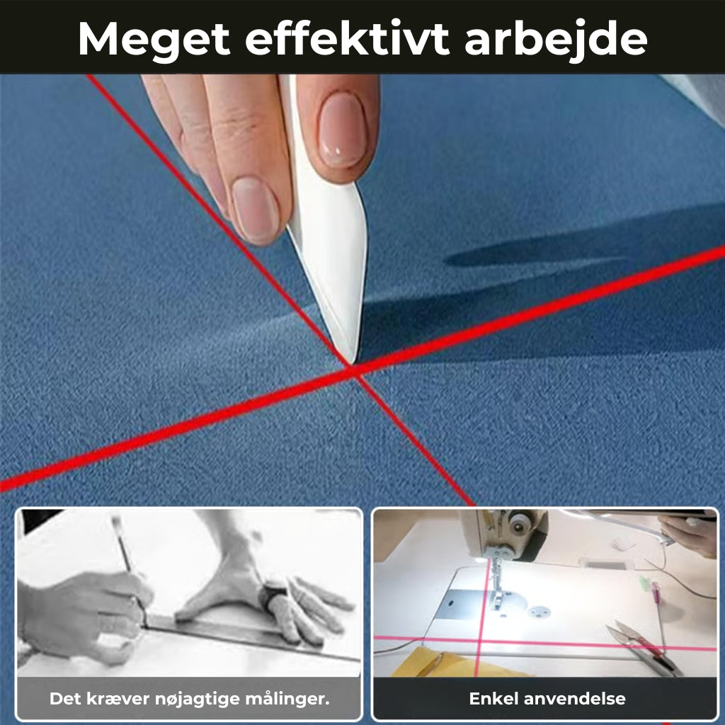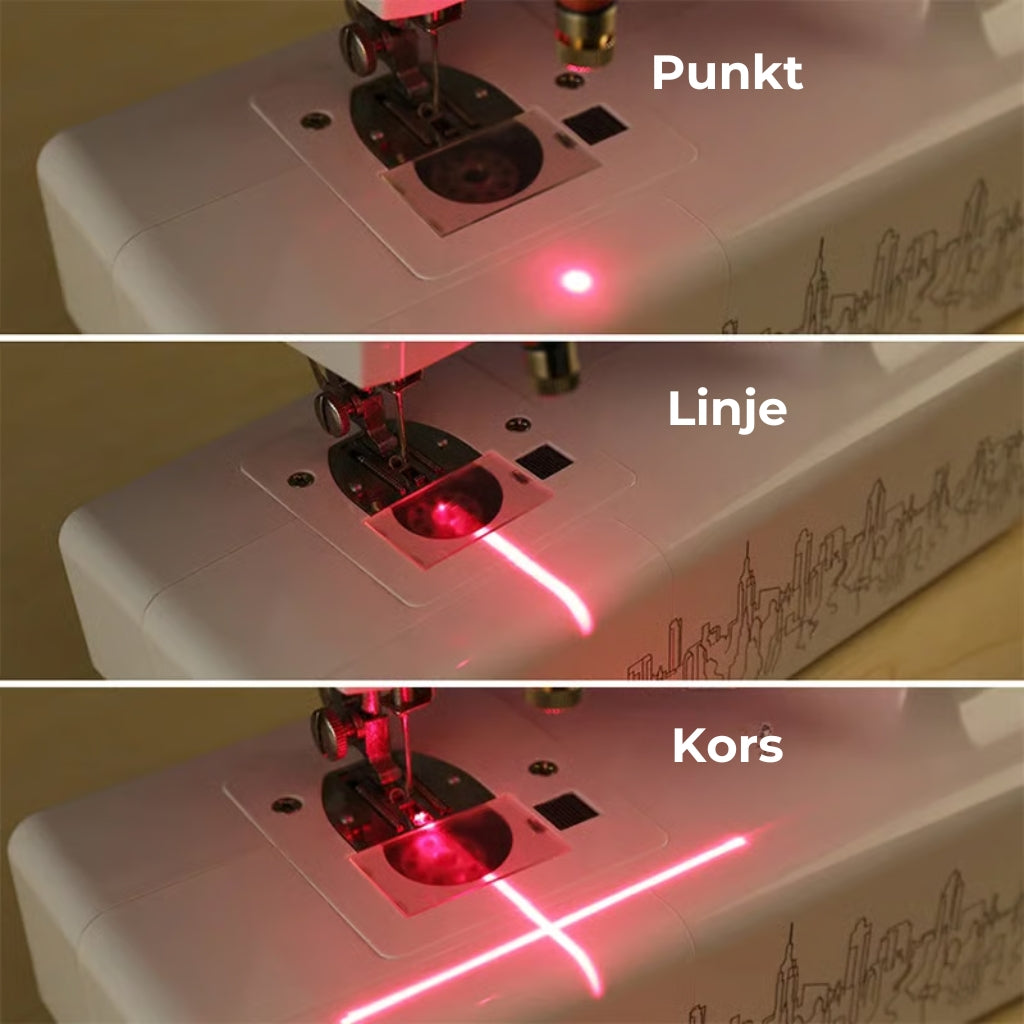 LASER MED JUSTERBAR BREDDE: Laseren kan justeres, så lysbredden øges, når du syr i mørke stoffer. Enheden har en tænd og sluk-knap, så laseren nemt kan slås fra, når den ikke bruges.