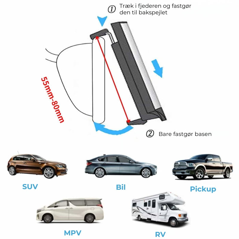 Spejlet er designet til hurtig og enkel montering. Med de justerbare klemmer kan du klikke det fast over dit nuværende bakspejl uden brug af værktøj. På få sekunder sidder det stabilt og er klar til brug.