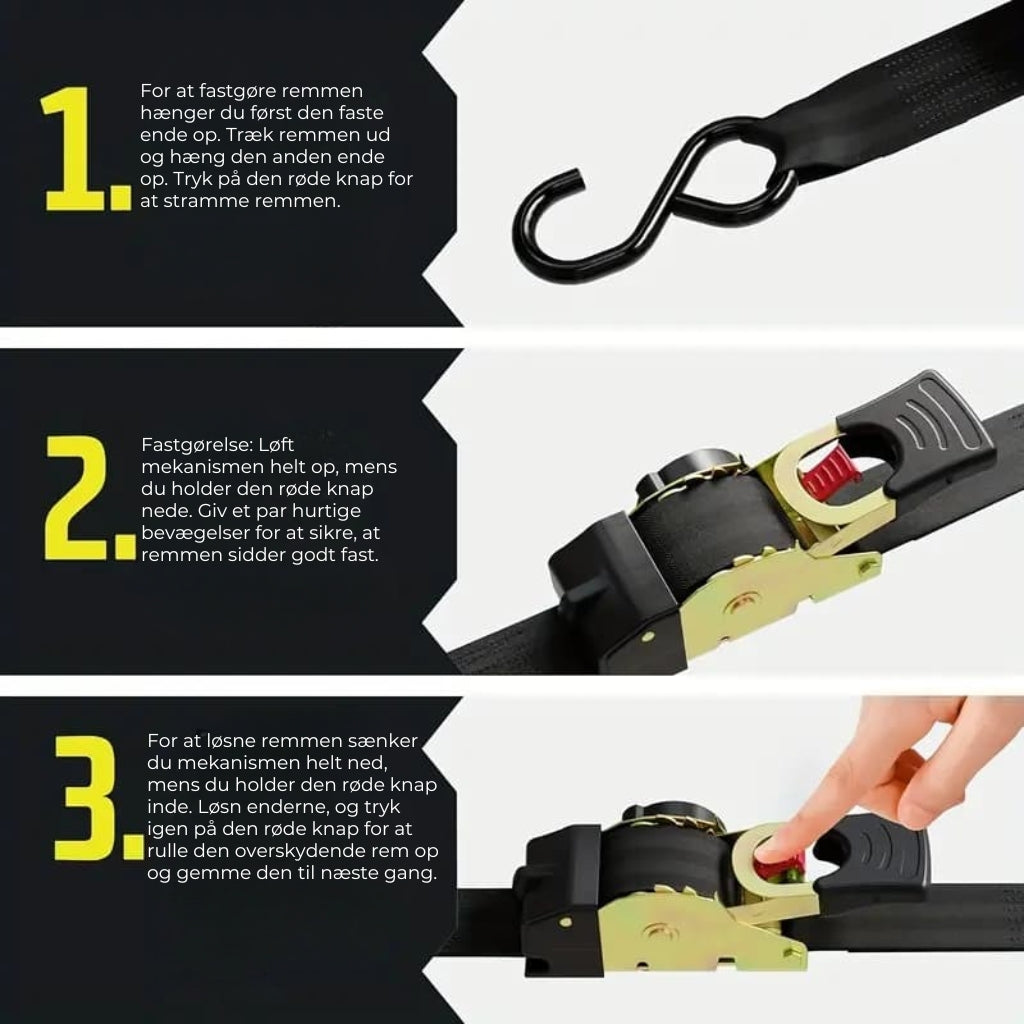 Vores indtrækkelige spændbånd er også udstyret med en anodiseret ratel, ergonomiske polstrede håndtag og belagte, fuldt bøjelige S-kroge. Du kan stole på, at disse indtrækkelige spændbånd kan klare selv de mest krævende transportopgaver.