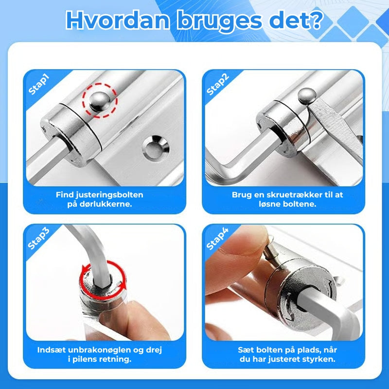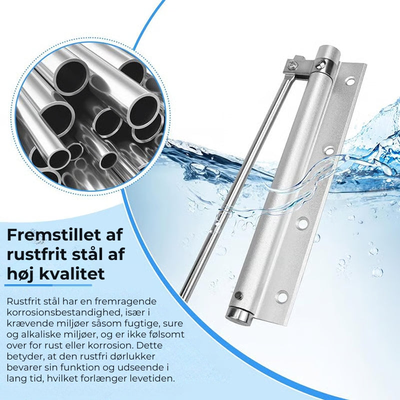 Denne automatiske dørhængsel sørger for, at døren lukker sig selv pålideligt, hvilket er praktisk i gange, kontorer, butikker og andre travle områder. Ingen åbne døre, ingen træk og ingen risiko for at glemme at lukke.