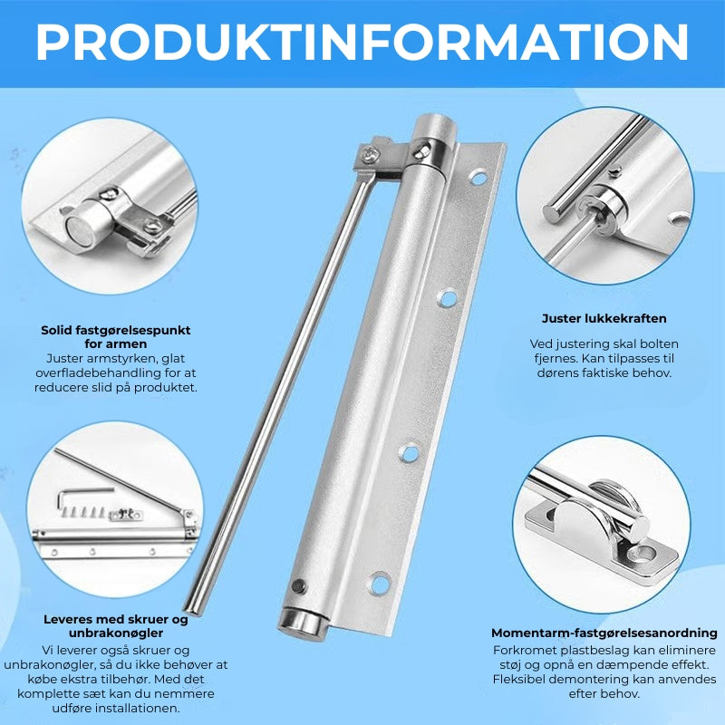 Monteringen er enkel. Skru hængslet fast i dørkarmen og på selve døren, justér fjederen til den ønskede styrke og sæt døren på plads igen. Den justerbare mekanisme og de standardiserede mål gør, at det passer til de fleste almindelige døre.