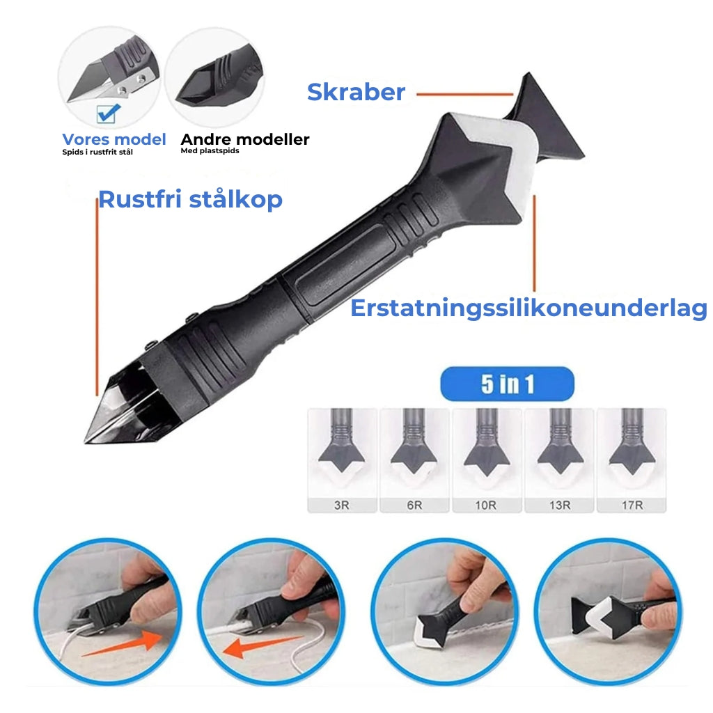 De rustfri skrabeflader gør det nemt at fjerne genstridig silikone, og den vendbare spartel hjælper dig med at få pæne og jævne fuger på kort tid.